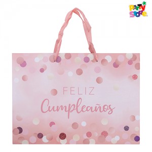 / BOLSA ROSA PASTEL *FELIZ CUMPLEAÑOS* x 1 un. Tamaño: 35cm x 25cm x 9cm